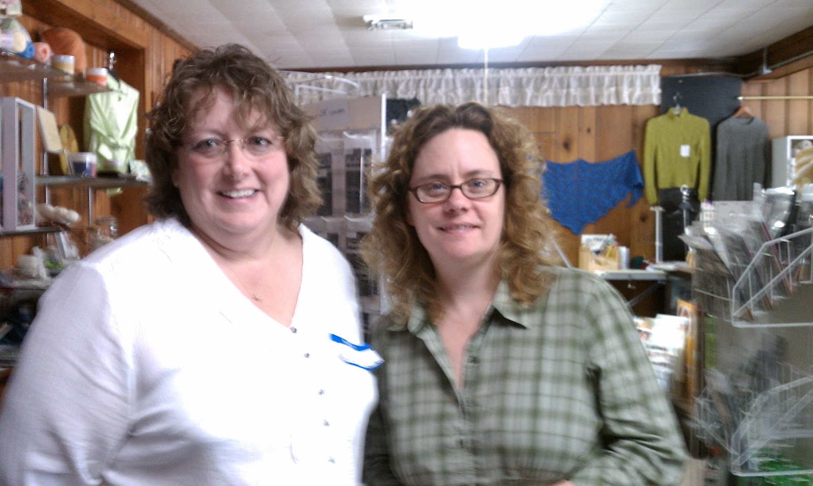 Cheryl and I had the unexpected opportunity to take a class with the Yarn Harlot herself, Stephanie Pearl-McPhee. It was a full day class at Knitting Today in Wolcottville, IN. Rather than leave at an ungodly time of the morning, we decided to drive up the day before. We made a couple of yarn shop visits along the way. Seriously, you know you all think that way...."How many yarn shops are between home & where I am traveling to?" First up was Knit Stop in Indianapolis. This is a very large yet lovely & inviting store in the Clearwater Shoppes area. While we were there we ran into Kate Larson from our SWIFT group. It turns out she teaches there. It's a small world we knitters live in.